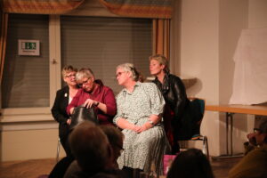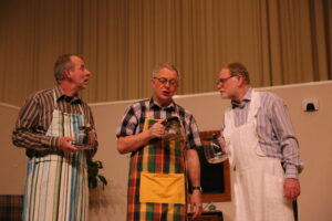 Nun geht es weiter in unserer Zeitreise der Theatergruppe. In all den Jahren gab es ca. 50 Schauspieler, jede Menge Statisten wie z.B. das Tambourcorps „Grün Weiß“ Langerwehe, die Pfadfinder, Feuerwehr, eine Turngruppe, Leierkastenmann, Skatspieler u.v.m. Regisseure bzw. Regisseurinnen waren in den 50 Jahren,1977 Josef Heinrich, von 1979-1983 Marlies Dreyer, von 1984-1994 Willi Maletz, von 1995-1999 Werner Gossel, von 2000-2003 Willibert Dick, 2004 u.2005 Uschi Nieveler, von 2006- 2016 Achim Ronig, von 2017- 2020 Jutta Schäfer und ab 2023 Christel Dick. 2021 u.2022 gab es wegen Corona kein Theaterstück. 1988 spielten wir das Stück „Et Carmen von Langerweh“, das von Willi Maletz selbst geschrieben wurde. Wir spielten Stücke, die schon auf der Bühne von Willi Millowitsch gesehen wurden, wie z.B. „Tante Jutta aus Kalkutta“1986, „Der Kühne Schwimmer“ 1987, „Pension Schöller“ 1997, bei diesem Stück brauchten wir drei verschiedene Bühnenbilder. Dies wurde von unseren Bühnenbauer sehr gut umgesetzt. Das war eine Höchstleistung, wo auch wir Spieler mit anpacken mussten. „Der Meisterboxer“ 1985 und zum 25jährigen Jubiläum 2002. Auch nahmen wir uns Theaterstücke vor, in dem wir die Gesundheitsreform 2010 mit „Gute Besserung“ oder die Altenpflege 2008 mit „Dreistes Stück im Greisenglück“, in lustiger Form darstellten. Aber was wäre ein Theaterstück ohne Schauspieler. Auch muss es hinter den Kulissen alles funktionieren. Die Bühne muss geplant und aufgebaut werden, die Requisiten werden besorgt. Da schaut jeder, was er von zu Hause entbehren kann. Kostüme müssen ausgesucht werden. Die Maskenbildner sind gefragt, hier muss auch alles zum Outfit passen. Für jeden Schauspieler heißt es jetzt „Mut zur Lücke“, d.h. dass man Kostüme und Maske anzieht, womit im wirklichen Leben, der ein oder andere, nicht mit rumlaufen würde. Aber auch das ist Theater. Dann kommt der Zeitpunkt, an dem die Bühne ausgestattet werden muss. Hier hat uns ein ortsansässiges Möbelhaus und ein Antiquitätenhändler, Möbel und Dekoartikel zur Verfügung gestellt. Mitwirkende der Theatergruppe räumten zum Teil ihre Wohnung aus und brachten diese auf die Bühne, ebenso Requisiten, Dekoartikel, aber auch Bilder und Wandschmuck.